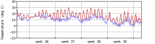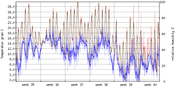 Die rote Kurve zeigt die Temperatur, die hellrote Fläche zeigt den Bereich zwischen höchsten und niedrigsten Temperatur während des Messintervals. Die blaue Kurve zeigt den Taupunkt, also die Temperatur, bei der sich Tau zu bilden beginnt. |