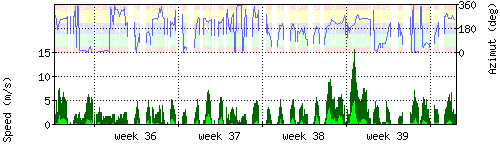 Der untere Teil des Graphen zeigt in hellgrün die mittlere Windgeschwindigkeit, die Spitzengeschwindigkeit ist dunkelgrün dargestellt, die zugehörige Skala findet sich am linken Rand. Der obere Teil des Graphen zeigt das Wind-Azimut in blau, die Skala steht am rechten Rand. |