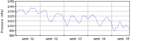 Der blaue Graph zeigt den mittleren Luftdruck, der Bereich zwischen grösstem und kleinstem Druck während des Messintervals ist in hellblau dargestellt. |
