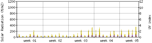 Das goldene Histogramm zeigt die totale Sonnestrahlung in W/m^2, die Skala befindet sich am linken Rand. Die violette Kurve zeigt den UV index, mit der Skala am rechten Rand. Man beachte, dass nach Schneefall die Messwerte nicht zuverlässig sind, weil die Sensoren nicht automatisch vom Schnee befreit werden. |
