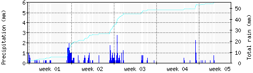 Das blaue Histogram zeigt die totale Niederschlagsmenge (oder deren Wassergehalt) in mm während des Messintervals. |