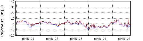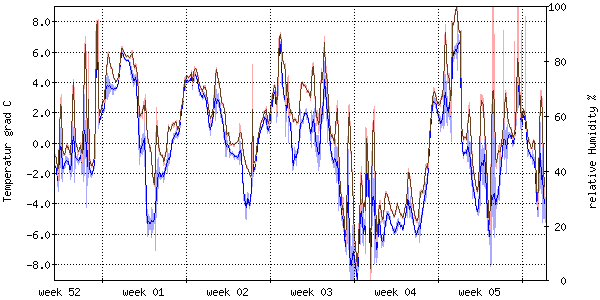 Die rote Kurve zeigt die Temperatur, die hellrote Fläche zeigt den Bereich zwischen höchsten und niedrigsten Temperatur während des Messintervals. Die blaue Kurve zeigt den Taupunkt, also die Temperatur, bei der sich Tau zu bilden beginnt. |