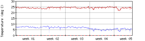 Die rote Kurve zeigt die Innentemperatur,die hellrote Fläche zeigt den Bereichh zwischen höchster und tiefster Temperatur während des Messzeitraums. |