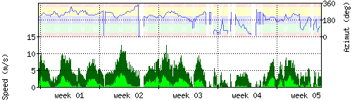 Der untere Teil des Graphen zeigt in hellgrün die mittlere Windgeschwindigkeit, die Spitzengeschwindigkeit ist dunkelgrün dargestellt, die zugehörige Skala findet sich am linken Rand. Der obere Teil des Graphen zeigt das Wind-Azimut in blau, die Skala steht am rechten Rand. |