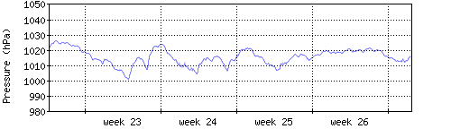 Der blaue Graph zeigt den mittleren Luftdruck, der Bereich zwischen grösstem und kleinstem Druck während des Messintervals ist in hellblau dargestellt. |