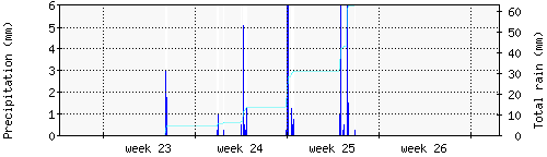 Das blaue Histogram zeigt die totale Niederschlagsmenge (oder deren Wassergehalt) in mm während des Messintervals. |