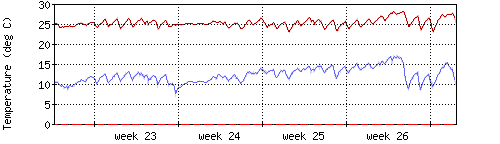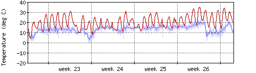 Die rote Kurve zeigt die Innentemperatur,die hellrote Fläche zeigt den Bereichh zwischen höchster und tiefster Temperatur während des Messzeitraums. |