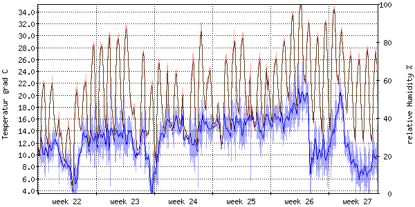 Die rote Kurve zeigt die Temperatur, die hellrote Fläche zeigt den Bereich zwischen höchsten und niedrigsten Temperatur während des Messintervals. Die blaue Kurve zeigt den Taupunkt, also die Temperatur, bei der sich Tau zu bilden beginnt. |