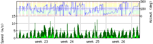 Der untere Teil des Graphen zeigt in hellgrün die mittlere Windgeschwindigkeit, die Spitzengeschwindigkeit ist dunkelgrün dargestellt, die zugehörige Skala findet sich am linken Rand. Der obere Teil des Graphen zeigt das Wind-Azimut in blau, die Skala steht am rechten Rand. |