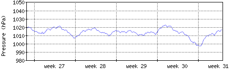 Der blaue Graph zeigt den mittleren Luftdruck, der Bereich zwischen grösstem und kleinstem Druck während des Messintervals ist in hellblau dargestellt. |