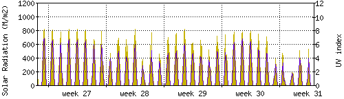 Das goldene Histogramm zeigt die totale Sonnestrahlung in W/m^2, die Skala befindet sich am linken Rand. Die violette Kurve zeigt den UV index, mit der Skala am rechten Rand. Man beachte, dass nach Schneefall die Messwerte nicht zuverlässig sind, weil die Sensoren nicht automatisch vom Schnee befreit werden. |