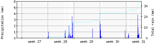 Das blaue Histogram zeigt die totale Niederschlagsmenge (oder deren Wassergehalt) in mm während des Messintervals. |