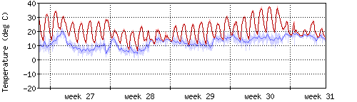 Die rote Kurve zeigt die Temperatur, die hellrote Fläche zeigt den Bereich zwischen höchsten und niedrigsten Temperatur während des Messintervals. Die blaue Kurve zeigt den Taupunkt, also die Temperatur, bei der sich Tau zu bilden beginnt. |