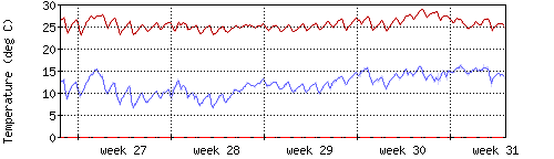 Die rote Kurve zeigt die Innentemperatur,die hellrote Fläche zeigt den Bereichh zwischen höchster und tiefster Temperatur während des Messzeitraums. |