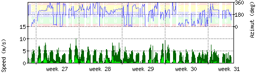 Der untere Teil des Graphen zeigt in hellgrün die mittlere Windgeschwindigkeit, die Spitzengeschwindigkeit ist dunkelgrün dargestellt, die zugehörige Skala findet sich am linken Rand. Der obere Teil des Graphen zeigt das Wind-Azimut in blau, die Skala steht am rechten Rand. |