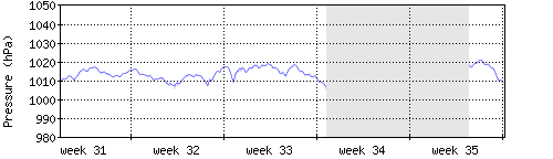 Der blaue Graph zeigt den mittleren Luftdruck, der Bereich zwischen grösstem und kleinstem Druck während des Messintervals ist in hellblau dargestellt. |