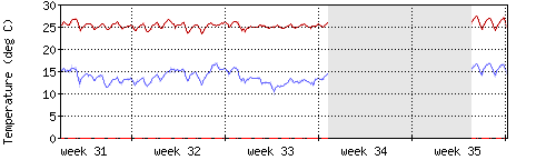 Die rote Kurve zeigt die Innentemperatur,die hellrote Fläche zeigt den Bereichh zwischen höchster und tiefster Temperatur während des Messzeitraums. |