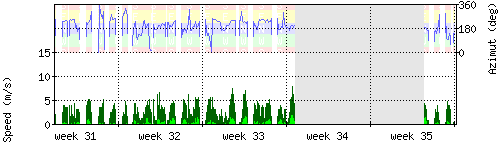 Der untere Teil des Graphen zeigt in hellgrün die mittlere Windgeschwindigkeit, die Spitzengeschwindigkeit ist dunkelgrün dargestellt, die zugehörige Skala findet sich am linken Rand. Der obere Teil des Graphen zeigt das Wind-Azimut in blau, die Skala steht am rechten Rand. |