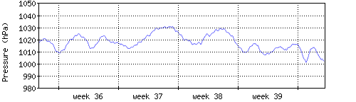 Der blaue Graph zeigt den mittleren Luftdruck, der Bereich zwischen grösstem und kleinstem Druck während des Messintervals ist in hellblau dargestellt. |