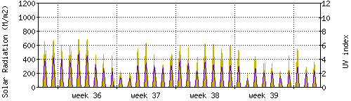Das goldene Histogramm zeigt die totale Sonnestrahlung in W/m^2, die Skala befindet sich am linken Rand. Die violette Kurve zeigt den UV index, mit der Skala am rechten Rand. Man beachte, dass nach Schneefall die Messwerte nicht zuverlässig sind, weil die Sensoren nicht automatisch vom Schnee befreit werden. |