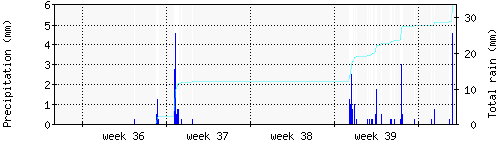 Das blaue Histogram zeigt die totale Niederschlagsmenge (oder deren Wassergehalt) in mm während des Messintervals. |