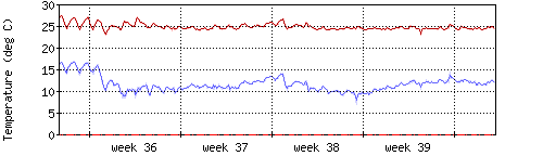 Die rote Kurve zeigt die Innentemperatur,die hellrote Fläche zeigt den Bereichh zwischen höchster und tiefster Temperatur während des Messzeitraums. |