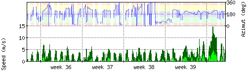 Der untere Teil des Graphen zeigt in hellgrün die mittlere Windgeschwindigkeit, die Spitzengeschwindigkeit ist dunkelgrün dargestellt, die zugehörige Skala findet sich am linken Rand. Der obere Teil des Graphen zeigt das Wind-Azimut in blau, die Skala steht am rechten Rand. |