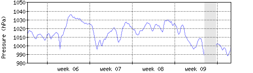 Der blaue Graph zeigt den mittleren Luftdruck, der Bereich zwischen grösstem und kleinstem Druck während des Messintervals ist in hellblau dargestellt. |