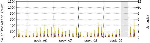 Das goldene Histogramm zeigt die totale Sonnestrahlung in W/m^2, die Skala befindet sich am linken Rand. Die violette Kurve zeigt den UV index, mit der Skala am rechten Rand. Man beachte, dass nach Schneefall die Messwerte nicht zuverlässig sind, weil die Sensoren nicht automatisch vom Schnee befreit werden. |