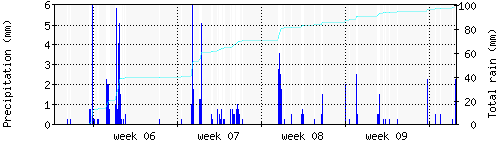 Das blaue Histogram zeigt die totale Niederschlagsmenge (oder deren Wassergehalt) in mm während des Messintervals. |
