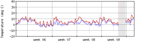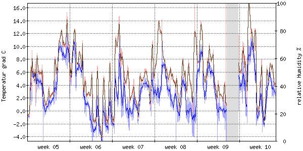 Die rote Kurve zeigt die Temperatur, die hellrote Fläche zeigt den Bereich zwischen höchsten und niedrigsten Temperatur während des Messintervals. Die blaue Kurve zeigt den Taupunkt, also die Temperatur, bei der sich Tau zu bilden beginnt. |