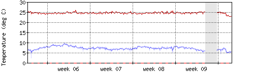 Die rote Kurve zeigt die Innentemperatur,die hellrote Fläche zeigt den Bereichh zwischen höchster und tiefster Temperatur während des Messzeitraums. |