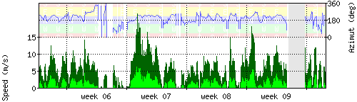 Der untere Teil des Graphen zeigt in hellgrün die mittlere Windgeschwindigkeit, die Spitzengeschwindigkeit ist dunkelgrün dargestellt, die zugehörige Skala findet sich am linken Rand. Der obere Teil des Graphen zeigt das Wind-Azimut in blau, die Skala steht am rechten Rand. |