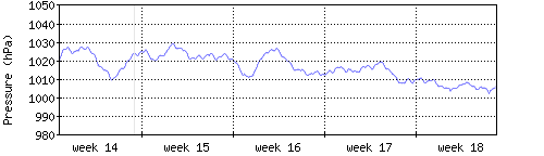 Der blaue Graph zeigt den mittleren Luftdruck, der Bereich zwischen grösstem und kleinstem Druck während des Messintervals ist in hellblau dargestellt. |