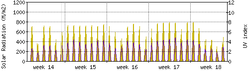 Das goldene Histogramm zeigt die totale Sonnestrahlung in W/m^2, die Skala befindet sich am linken Rand. Die violette Kurve zeigt den UV index, mit der Skala am rechten Rand. Man beachte, dass nach Schneefall die Messwerte nicht zuverlässig sind, weil die Sensoren nicht automatisch vom Schnee befreit werden. |