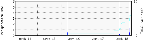 Das blaue Histogram zeigt die totale Niederschlagsmenge (oder deren Wassergehalt) in mm während des Messintervals. |