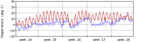 Die rote Kurve zeigt die Temperatur, die hellrote Fläche zeigt den Bereich zwischen höchsten und niedrigsten Temperatur während des Messintervals. Die blaue Kurve zeigt den Taupunkt, also die Temperatur, bei der sich Tau zu bilden beginnt. |