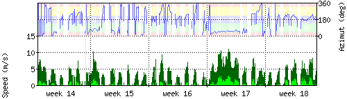 Der untere Teil des Graphen zeigt in hellgrün die mittlere Windgeschwindigkeit, die Spitzengeschwindigkeit ist dunkelgrün dargestellt, die zugehörige Skala findet sich am linken Rand. Der obere Teil des Graphen zeigt das Wind-Azimut in blau, die Skala steht am rechten Rand. |