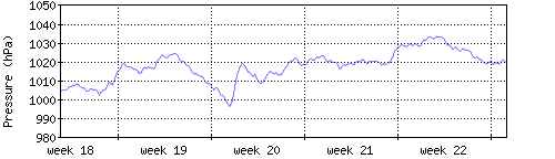 Der blaue Graph zeigt den mittleren Luftdruck, der Bereich zwischen grösstem und kleinstem Druck während des Messintervals ist in hellblau dargestellt. |