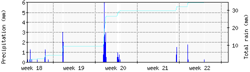 Das blaue Histogram zeigt die totale Niederschlagsmenge (oder deren Wassergehalt) in mm während des Messintervals. |