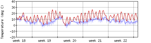 Die rote Kurve zeigt die Temperatur, die hellrote Fläche zeigt den Bereich zwischen höchsten und niedrigsten Temperatur während des Messintervals. Die blaue Kurve zeigt den Taupunkt, also die Temperatur, bei der sich Tau zu bilden beginnt. |