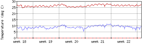 Die rote Kurve zeigt die Innentemperatur,die hellrote Fläche zeigt den Bereichh zwischen höchster und tiefster Temperatur während des Messzeitraums. |