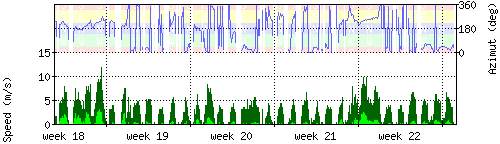 Der untere Teil des Graphen zeigt in hellgrün die mittlere Windgeschwindigkeit, die Spitzengeschwindigkeit ist dunkelgrün dargestellt, die zugehörige Skala findet sich am linken Rand. Der obere Teil des Graphen zeigt das Wind-Azimut in blau, die Skala steht am rechten Rand. |