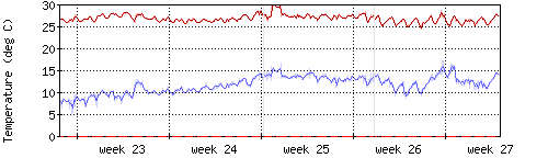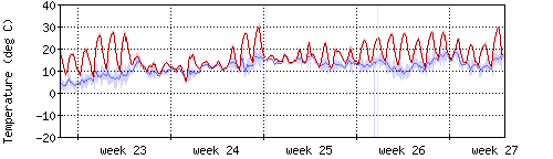 Die rote Kurve zeigt die Innentemperatur,die hellrote Fläche zeigt den Bereichh zwischen höchster und tiefster Temperatur während des Messzeitraums. |