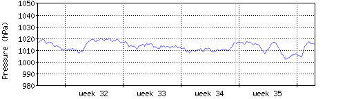 Der blaue Graph zeigt den mittleren Luftdruck, der Bereich zwischen grösstem und kleinstem Druck während des Messintervals ist in hellblau dargestellt. |