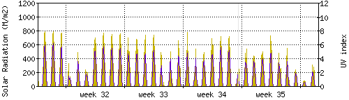 Das goldene Histogramm zeigt die totale Sonnestrahlung in W/m^2, die Skala befindet sich am linken Rand. Die violette Kurve zeigt den UV index, mit der Skala am rechten Rand. Man beachte, dass nach Schneefall die Messwerte nicht zuverlässig sind, weil die Sensoren nicht automatisch vom Schnee befreit werden. |