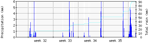 Das blaue Histogram zeigt die totale Niederschlagsmenge (oder deren Wassergehalt) in mm während des Messintervals. |
