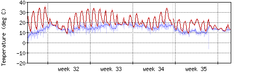 Die rote Kurve zeigt die Innentemperatur,die hellrote Fläche zeigt den Bereichh zwischen höchster und tiefster Temperatur während des Messzeitraums. |