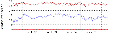Die rote Kurve zeigt die Temperatur, die hellrote Fläche zeigt den Bereich zwischen höchsten und niedrigsten Temperatur während des Messintervals. Die blaue Kurve zeigt den Taupunkt, also die Temperatur, bei der sich Tau zu bilden beginnt. |