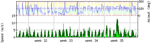 Der untere Teil des Graphen zeigt in hellgrün die mittlere Windgeschwindigkeit, die Spitzengeschwindigkeit ist dunkelgrün dargestellt, die zugehörige Skala findet sich am linken Rand. Der obere Teil des Graphen zeigt das Wind-Azimut in blau, die Skala steht am rechten Rand. |